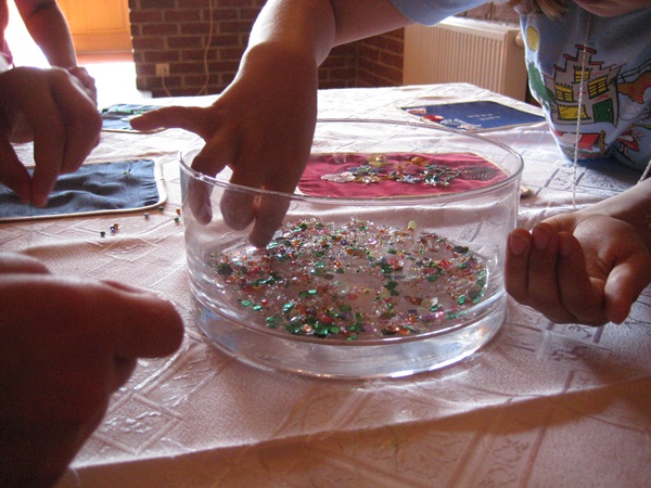 cekinami oraz koralikami na materiale. Uczestnicy uczą się